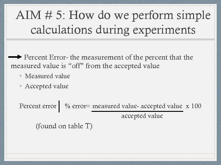 AIM # 5: How do we perform simple calculations during experiments Percent Error- the measurement of the percent that the measured value is “off” from the accepted value • Measured value • Accepted value Percent error % error= measured value- accepted value x 100 accepted value (found on table T)
