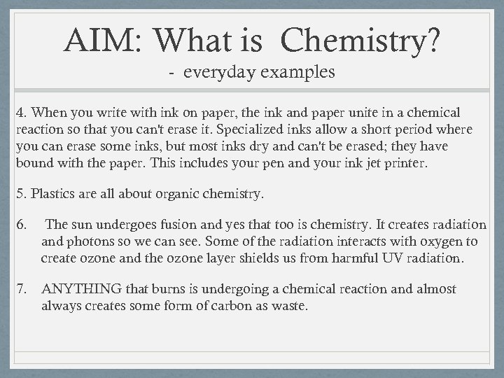 AIM: What is Chemistry? - everyday examples 4. When you write with ink on paper, the ink and paper unite in a chemical reaction so that you can't erase it. Specialized inks allow a short period where you can erase some inks, but most inks dry and can't be erased; they have bound with the paper. This includes your pen and your ink jet printer. 5. Plastics are all about organic chemistry. 6. The sun undergoes fusion and yes that too is chemistry. It creates radiation and photons so we can see. Some of the radiation interacts with oxygen to create ozone and the ozone layer shields us from harmful UV radiation. 7. ANYTHING that burns is undergoing a chemical reaction and almost always creates some form of carbon as waste.