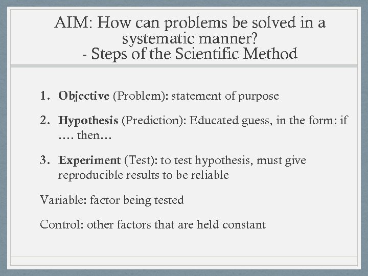 AIM: How can problems be solved in a systematic manner? - Steps of the Scientific Method 1. Objective (Problem): statement of purpose 2. Hypothesis (Prediction): Educated guess, in the form: if …. then… 3. Experiment (Test): to test hypothesis, must give reproducible results to be reliable Variable: factor being tested Control: other factors that are held constant