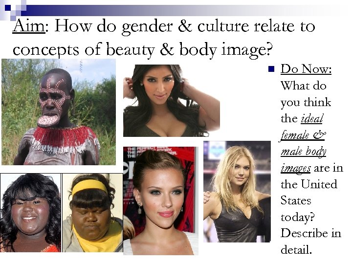 Aim: How do gender & culture relate to concepts of beauty & body image? n Do Now: What do you think the ideal female & male body images are in the United States today? Describe in detail.