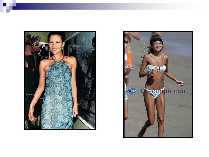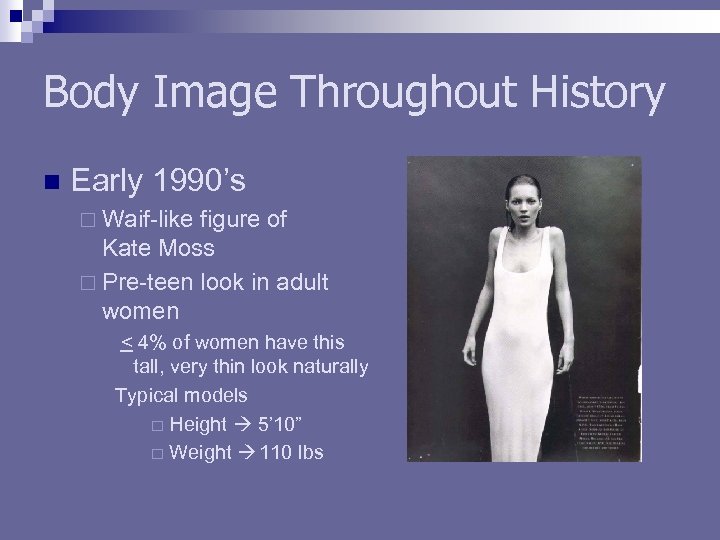 Body Image Throughout History n Early 1990’s ¨ Waif-like figure of Kate Moss ¨ Pre-teen look in adult women < 4% of women have this tall, very thin look naturally Typical models ¨ Height 5’ 10” ¨ Weight 110 lbs