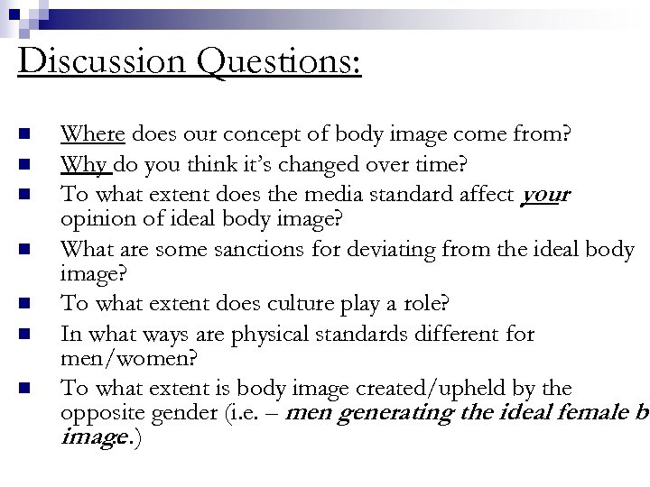 Discussion Questions: n n n n Where does our concept of body image come from? Why do you think it’s changed over time? To what extent does the media standard affect your opinion of ideal body image? What are some sanctions for deviating from the ideal body image? To what extent does culture play a role? In what ways are physical standards different for men/women? To what extent is body image created/upheld by the opposite gender (i. e. – men generating the ideal female bo image …)