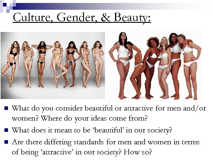 Culture, Gender, & Beauty: n n n What do you consider beautiful or attractive for men and/or women? Where do your ideas come from? What does it mean to be ‘beautiful’ in our society? Are there differing standards for men and women in terms of being ‘attractive’ in our society? How so?