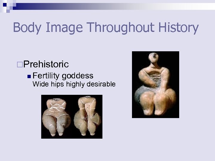 Body Image Throughout History ¨Prehistoric n Fertility goddess Wide hips highly desirable