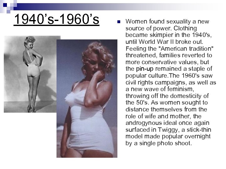 1940’s-1960’s n Women found sexuality a new source of power. Clothing became skimpier in the 1940's, until World War II broke out. Feeling the "American tradition" threatened, families reverted to more conservative values, but the pin-up remained a staple of popular culture. The 1960's saw civil rights campaigns, as well as a new wave of feminism, throwing off the domesticity of the 50's. As women sought to distance themselves from the role of wife and mother, the androgynous ideal once again surfaced in Twiggy, a stick-thin model made popular overnight by a single photo shoot.