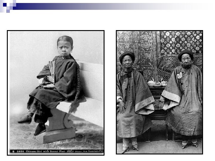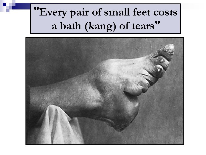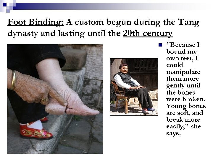 Foot Binding: A custom begun during the Tang dynasty and lasting until the 20 th century n "Because I bound my own feet, I could manipulate them more gently until the bones were broken. Young bones are soft, and break more easily, " she says.