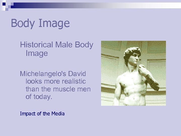 Body Image Historical Male Body Image Michelangelo's David looks more realistic than the muscle men of today. Impact of the Media