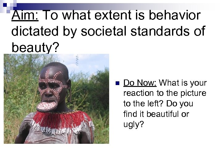 Aim: To what extent is behavior dictated by societal standards of beauty? n Do Now: What is your reaction to the picture to the left? Do you find it beautiful or ugly?