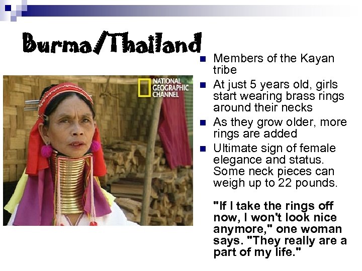 Burma/Thailand • • Members of the Kayan tribe At just 5 years old, girls start wearing brass rings around their necks As they grow older, more rings are added Ultimate sign of female elegance and status. Some neck pieces can weigh up to 22 pounds. "If I take the rings off now, I won't look nice anymore, " one woman says. "They really are a part of my life. "