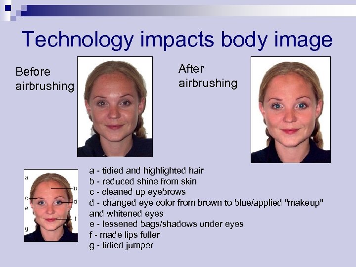 Technology impacts body image Before airbrushing After airbrushing a - tidied and highlighted hair b - reduced shine from skin c - cleaned up eyebrows d - changed eye color from brown to blue/applied "makeup" and whitened eyes e - lessened bags/shadows under eyes f - made lips fuller g - tidied jumper