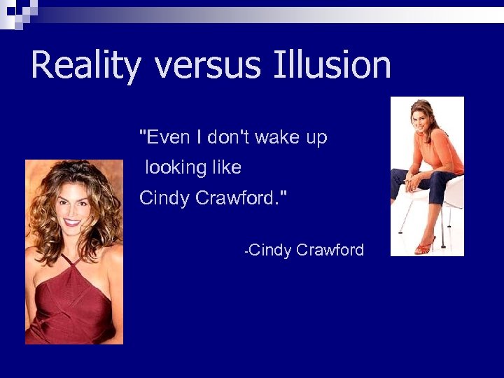 Reality versus Illusion "Even I don't wake up looking like Cindy Crawford. " -Cindy Crawford