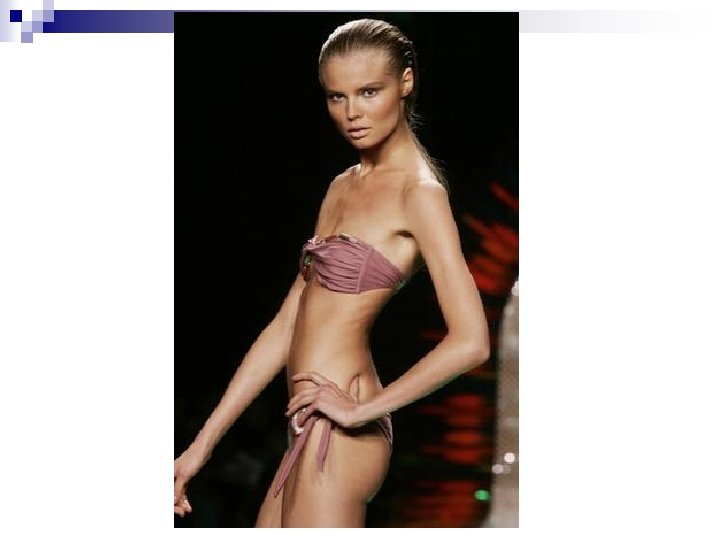 Body Image Throughout History n Late 1990’s ¨ Narrow hips yet large breasts Rare combination without breast implants n Typical models ¨ Height 5’ 10” ¨ Weight 110 lbs. n