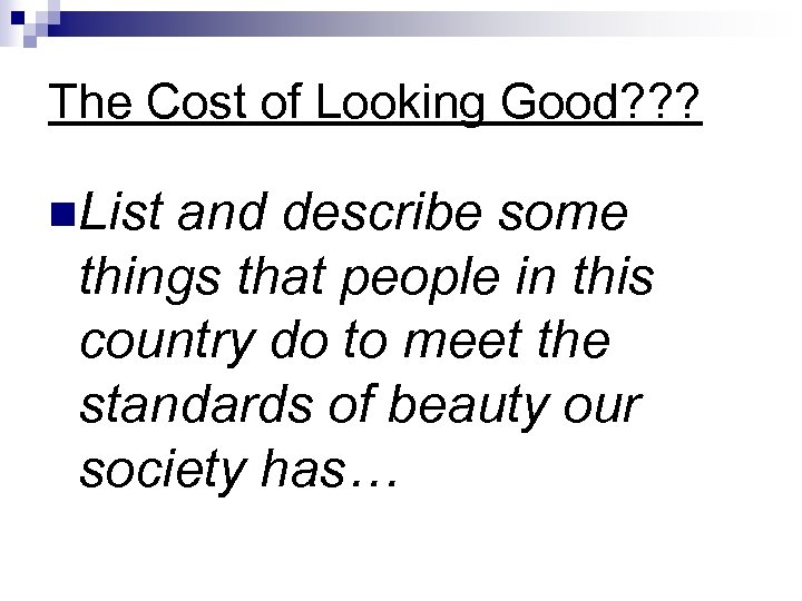 The Cost of Looking Good? ? ? n. List and describe some things that people in this country do to meet the standards of beauty our society has…