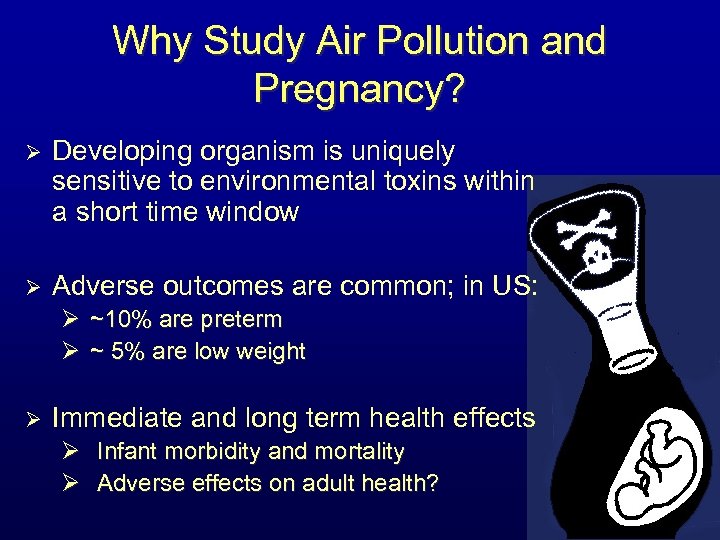 Why Study Air Pollution and Pregnancy? Ø Developing organism is uniquely sensitive to environmental toxins within a short time window Ø Adverse outcomes are common; in US: Ø ~10% are preterm Ø ~ 5% are low weight Ø Immediate and long term health effects Ø Infant morbidity and mortality Ø Adverse effects on adult health?