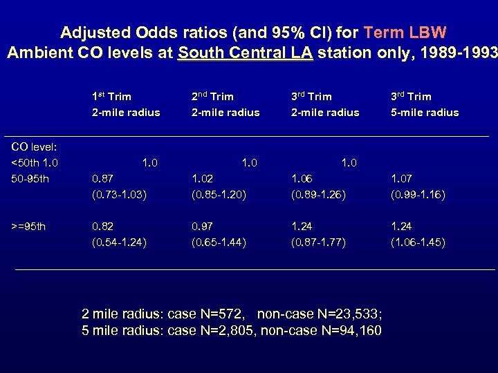 Summary of So. CAB Studies Ø Ø Ø Ritz and Yu (1999) evaluated association between CO exposures during 3 rd trimester and risk of term LBW Infants born 1989 -1993 to women living in So. CAB Exposure based on CO measurements at SCAQMD monitoring stations (n=18) – Focused on mothers who resided within 2 miles of a CO monitoring station (n=125, 573) Ø For each child calculated last trimester average CO concentration using the ambient monitoring station within 2 miles