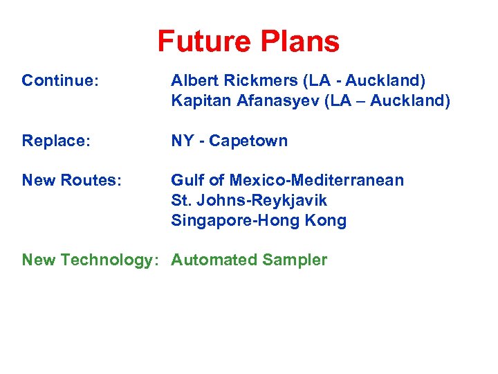 Future Plans Continue: Albert Rickmers (LA - Auckland) Kapitan Afanasyev (LA – Auckland) Replace: NY - Capetown New Routes: Gulf of Mexico-Mediterranean St. Johns-Reykjavik Singapore-Hong Kong New Technology: Automated Sampler