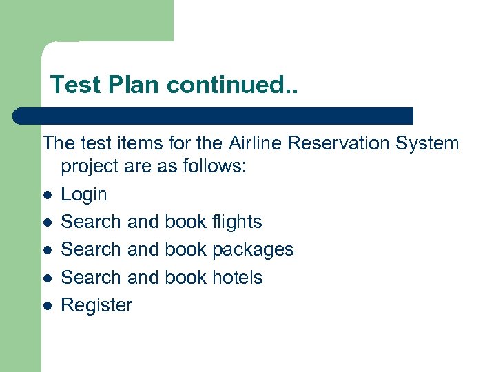 Test Plan continued. . The test items for the Airline Reservation System project are as follows: l Login l Search and book flights l Search and book packages l Search and book hotels l Register
