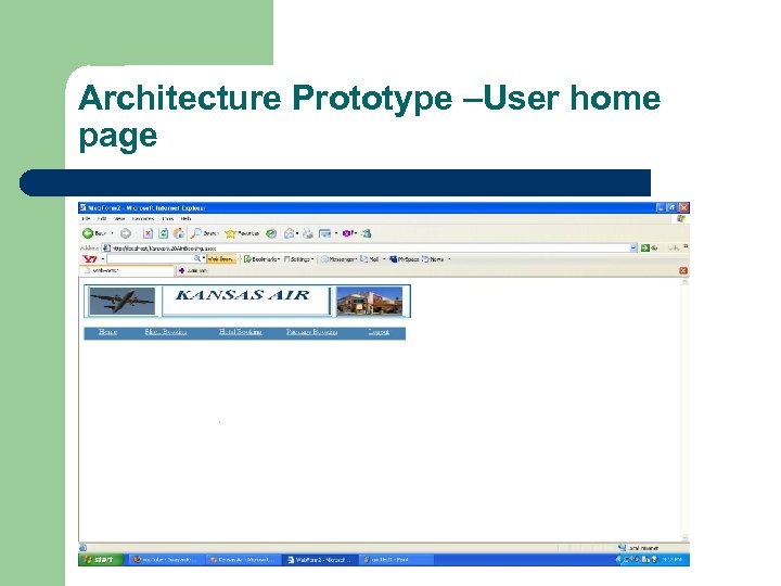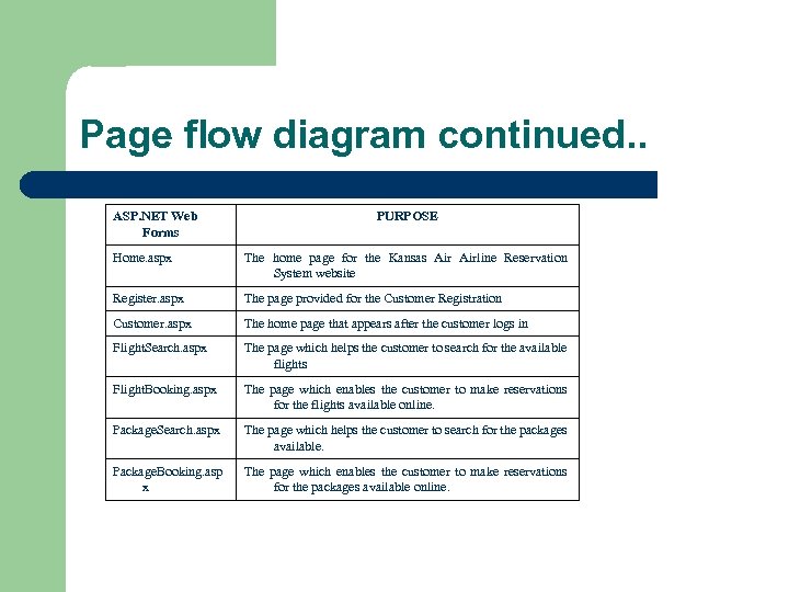 Page flow diagram continued. . ASP. NET Web Forms PURPOSE Home. aspx The home page for the Kansas Airline Reservation System website Register. aspx The page provided for the Customer Registration Customer. aspx The home page that appears after the customer logs in Flight. Search. aspx The page which helps the customer to search for the available flights Flight. Booking. aspx The page which enables the customer to make reservations for the flights available online. Package. Search. aspx The page which helps the customer to search for the packages available. Package. Booking. asp x The page which enables the customer to make reservations for the packages available online.