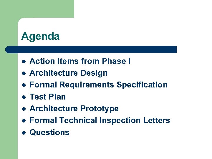 Agenda l l l l Action Items from Phase I Architecture Design Formal Requirements Specification Test Plan Architecture Prototype Formal Technical Inspection Letters Questions