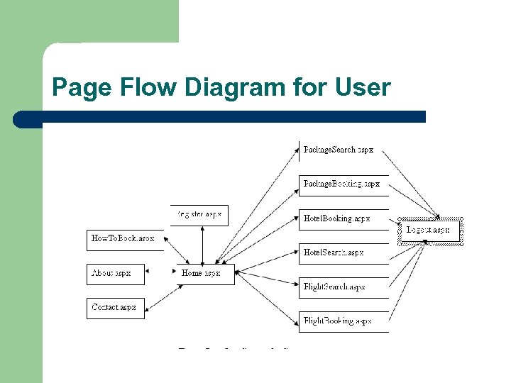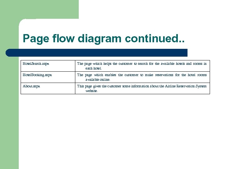 Page flow diagram continued. . Hotel. Search. aspx The page which helps the customer to search for the available hotels and rooms in each hotel. Hotel. Booking. aspx The page which enables the customer to make reservations for the hotel rooms available online. About. aspx This page gives the customer some information about the Airline Reservation System website.