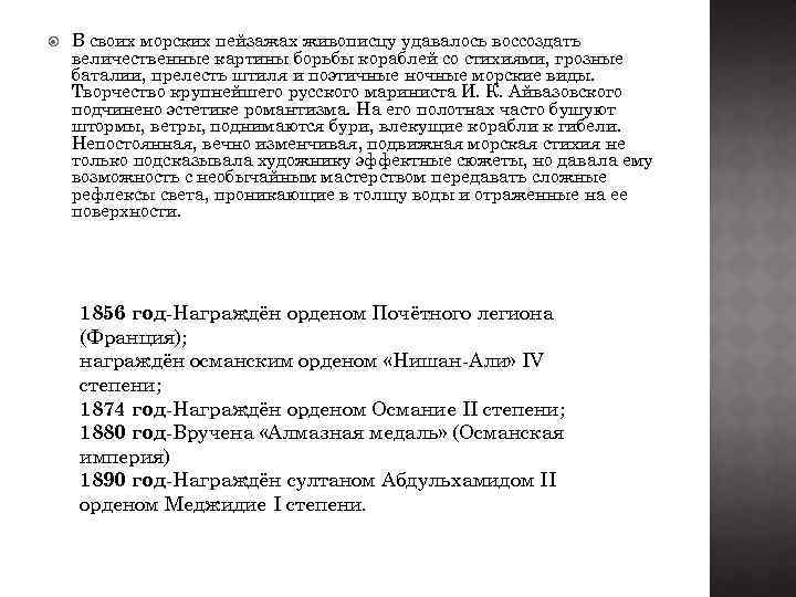 В своих морских пейзажах живописцу удавалось воссоздать величественные картины борьбы кораблей со стихиями, грозные баталии, прелесть штиля и поэтичные ночные морские виды. Творчество крупнейшего русского мариниста И. К. Айвазовского подчинено эстетике романтизма. На его полотнах часто бушуют штормы, ветры, поднимаются бури, влекущие корабли к гибели. Непостоянная, вечно изменчивая, подвижная морская стихия не только подсказывала художнику эффектные сюжеты, но давала ему возможность с необычайным мастерством передавать сложные рефлексы света, проникающие в толщу воды и отраженные на ее поверхности. 1856 год Награждён орденом Почётного легиона (Франция); награждён османским орденом «Нишан Али» IV степени; 1874 год Награждён орденом Османие II степени; 1880 год Вручена «Алмазная медаль» (Османская империя) 1890 год Награждён султаном Абдульхамидом II орденом Меджидие I степени.