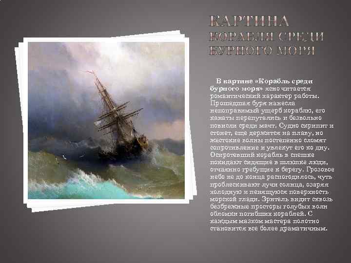 В картине «Корабль среди бурного моря» ясно читается романтический характер работы. Прошедшая буря нанесла непоправимый ущерб кораблю, его канаты перепутались и безвольно повисли среди мачт. Судно скрипит и стонет, еще держится на плаву, но жестокие волны постепенно сломят сопротивление и увлекут его ко дну. Осиротевший корабль в спешке покидают сидящие в шлюпке люди, отчаянно гребущие к берегу. Грозовое небо не до конца распогодилось, чуть проблескивают лучи солнца, озаряя холодную и пенящуюся поверхность морской глади. Зритель видит сквозь безбрежные просторы голубых волн обломки погибших кораблей. С каждым мазком мастера полотно становится все более драматичным.
