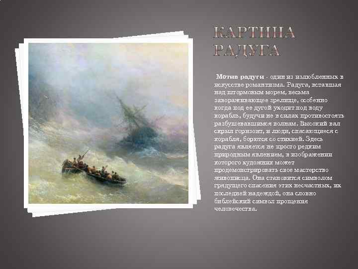 Мотив радуги один из излюбленных в искусстве романтизма. Радуга, вставшая над штормовым морем, весьма завораживающее зрелище, особенно когда под ее дугой уходит под воду корабль, будучи не в силах противостоять разбушевавшимся волнам. Высокий вал скрыл горизонт, и люди, спасающиеся с корабля, борются со стихией. Здесь радуга является не просто редким природным явлением, в изображении которого художник может продемонстрировать свое мастерство живописца. Она становится символом грядущего спасения этих несчастных, их последней надеждой, она словно библейский символ прощения человечества.