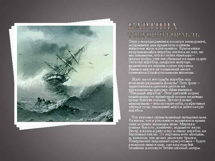 Серо ультрамариновая палитра пасмурного, штормового дня врывается плеском косматых волн в реальность. Критически накренившийся корабль несётся на нас, но мы понимаем, что в глазах команды – острые рифы, уже погубившие не одно судно. Остатки корабля, шедшего впереди, виднеются на первом плане картины. Равные паруса на сломанной мачте сливаются с сизо стальными волнами. Ждёт ли та же судьба корабль под отчаянно рвущимся флагом? Этот флаг – единственная цветная деталь на карандашном рисунке Айвазовского "Тонущий корабль". Этот цветной штрих символизирует крохотный штрих надежды среди буйства стихии. Всё остальное монохромно – жёлто серое небо, графитовые чёрные тучи, свинцовое море и даже силуэт корабля. Эта картина пронизывающе эмоциональна. Кажется, что в реальность врываются крики чаек и грохот кипящих волн. Морская стихия бунтует, клокочет, вздымает валы. Ветер в клочья рвёт пену и гонит корабль на береговые скалы. От картины веет холодом, и, кажется, что до нас долетают брызги. Невероятное ощущение присутствия – будто раскрыто окно в мир, где над судьбой человека властвует безжалостный шторм.