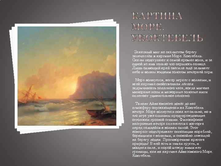 Закатный миг на скалистом берегу запечатлён в картине Море. Коктебель. Скалы подступают к самой кромке волн, и за одной из них только что скрылось солнце. Лишь сияющий край светила ещё заливает небо и волны жидким золотом вечерней зари. Море волнуется, ветер играет с волнами, и всей картине свойственная лёгкая задумчивость закатного часа, когда мягкие минорные ноты и мажорные золотые нити сплетают удивительное полотно. Талант Айвазовского донёс до нас атмосферу опускающегося на Коктебель вечера. Море волнуется пока не сильно, но в его игре уже слышны предупреждающие отголоски грозной стихии. Философское настроение вечера сплетается с восторга перед таящейся в волнах силой. Этот контраст подчёркивает оппозиции кораблей, борющихся с волнами, и спокойно лежащей на берегу лодки. Противоречива красота природы! В ней есть и тихая грусть, и мощная сила, и порой между ними нет границы, как на картине Айвазовского Море. Коктебель.