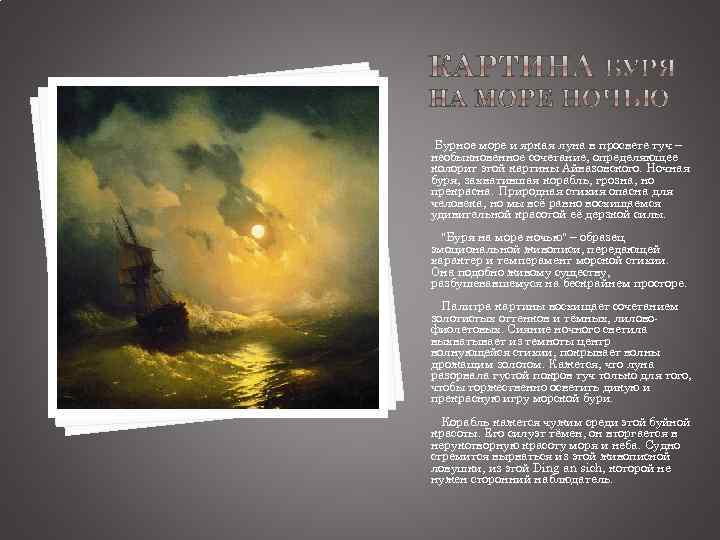 Бурное море и яркая луна в просвете туч – необыкновенное сочетание, определяющее колорит этой картины Айвазовского. Ночная буря, захватившая корабль, грозна, но прекрасна. Природная стихия опасна для человека, но мы всё равно восхищаемся удивительной красотой её дерзкой силы. "Буря на море ночью" – образец эмоциональной живописи, передающей характер и темперамент морской стихии. Она подобно живому существу, разбушевавшемуся на бескрайнем просторе. Палитра картины восхищает сочетанием золотистых оттенков и тёмных, лилово фиолетовых. Сияние ночного светила выхватывает из темноты центр волнующейся стихии, покрывает волны дрожащим золотом. Кажется, что луна разорвала густой покров туч только для того, чтобы торжественно осветить дикую и прекрасную игру морской бури. Корабль кажется чужим среди этой буйной красоты. Его силуэт тёмен, он вторгается в нерукотворную красоту моря и неба. Судно стремится вырваться из этой живописной ловушки, из этой Ding an sich, которой не нужен сторонний наблюдатель.