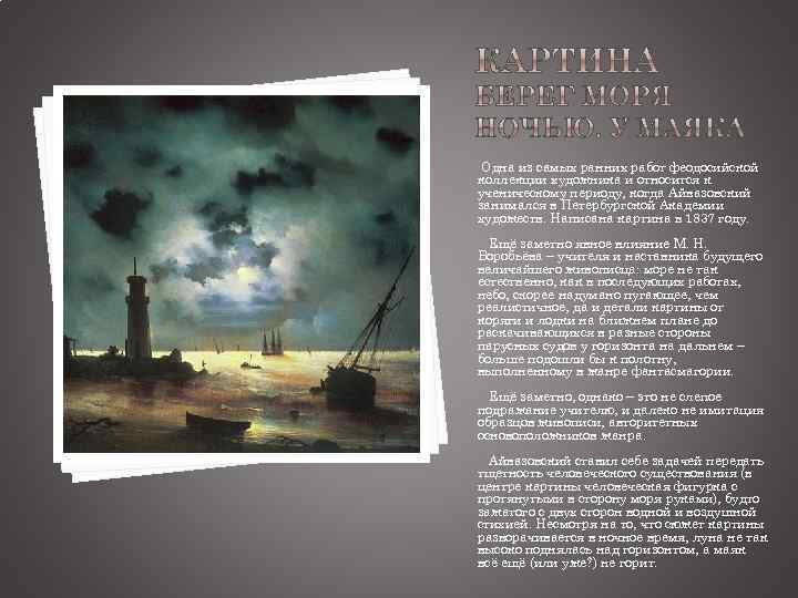 Одна из самых ранних работ феодосийской коллекции художника и относится к ученическому периоду, когда Айвазовский занимался в Петербургской Академии художеств. Написана картина в 1837 году. Ещё заметно явное влияние М. Н. Воробьёва – учителя и наставника будущего величайшего живописца: море не так естественно, как в последующих работах, небо, скорее надумано пугающее, чем реалистичное, да и детали картины от коряги и лодки на ближнем плане до раскачивающихся в разные стороны парусных судов у горизонта на дальнем – больше подошли бы к полотну, выполненному в жанре фантасмагории. Ещё заметно, однако – это не слепое подражание учителю, и далеко не имитация образцов живописи, авторитетных основоположников жанра. Айвазовский ставил себе задачей передать тщетность человеческого существования (в центре картины человеческая фигурка с протянутыми в сторону моря руками), будто зажатого с двух сторон водной и воздушной стихией. Несмотря на то, что сюжет картины разворачивается в ночное время, луна не так высоко поднялась над горизонтом, а маяк всё ещё (или уже? ) не горит.