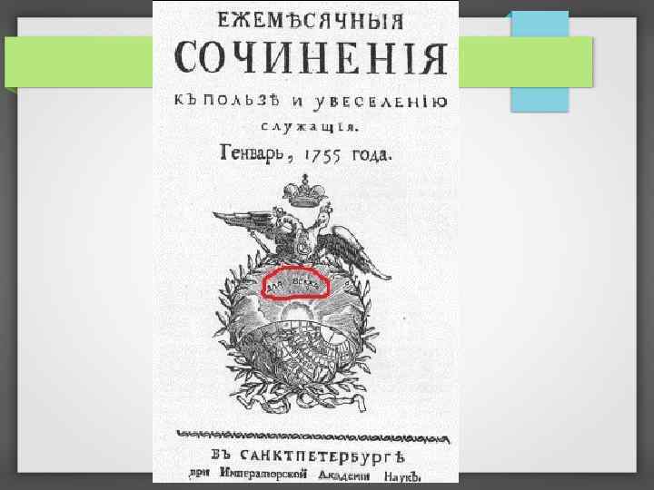 Названия журнала 1755 - 1757 «Ежемесячные сочинения, к пользе и увеселению служащие» . 1758 – 1763 «Сочинения и переводы, к пользе и увеселению служащие» . 1763 – 1764 «Ежемесячные сочинения и известия о ученых делах»
