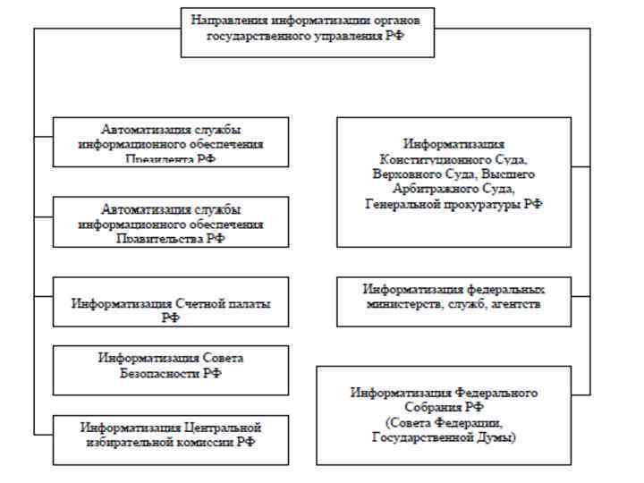 Функции государства в области управления информационными ресурсами: • создание первичных и производных информационных массивов и продуктов, необходимых для выполнения всего комплекса задач государственного управления и реализации конституционных прав граждан на доступ к информации; • надежное хранение и защита информационных ресурсов; • эффективное использование информационных ресурсов в деятельности органов власти и государственных учреждений; • обеспечение свободного доступа граждан и организаций к информационным ресурсам в соответствии с Конституцией и действующим законодательством Российской Федерации.