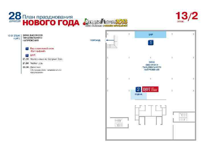 Монтаж 28 декабря 27. 12 с 12. 00 - технический монтаж с 18. 00 до 22. 00 - монтаж зон активностей. К вашим услугам По окончании монтажа зон активностей ВСЕ крупное оборудование (экраны, столы, стулья, проекторы, банеры, компьютеры) должно быть максимально установлено на площадках и ПРОТЕСТИРОВАНО. Реквизит можно будет завезти утром 28. 12 , но не позднее 12. 00. Склад реквизита – 10 этаж, помещение организаторов 28. 12 в 17. 00 - полная готовность зон активностей. 17. 00 - кофе и бутерброды для персонала (3 этаж, фойе) 18. 00 - начало работы 23. 30 - 24. 00 - окончание работы 24. 00 - 02. 00 - демонтаж