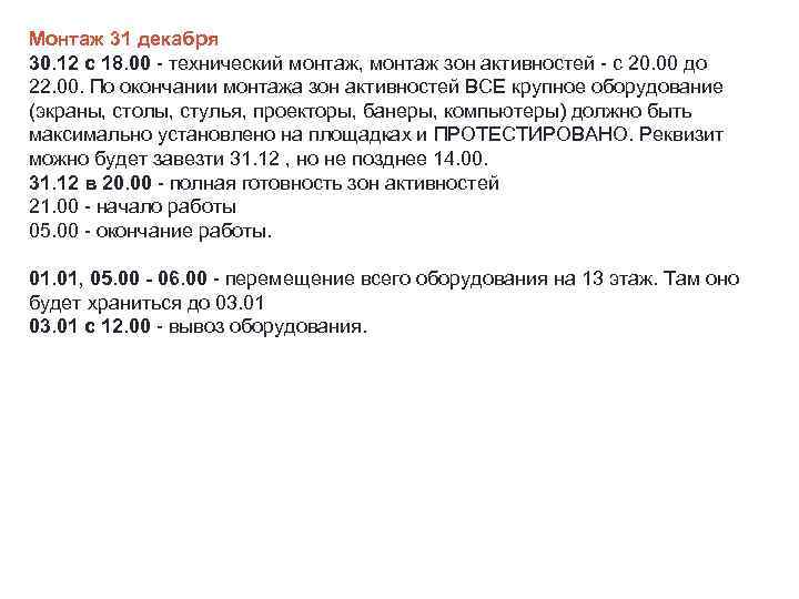Монтаж 31 декабря 30. 12 с 18. 00 - технический монтаж, монтаж зон активностей - с 20. 00 до 22. 00. По окончании монтажа зон активностей ВСЕ крупное оборудование (экраны, столы, стулья, проекторы, банеры, компьютеры) должно быть максимально установлено на площадках и ПРОТЕСТИРОВАНО. Реквизит можно будет завезти 31. 12 , но не позднее 14. 00. 31. 12 в 20. 00 - полная готовность зон активностей 21. 00 - начало работы 05. 00 - окончание работы. 01. 01, 05. 00 - 06. 00 - перемещение всего оборудования на 13 этаж. Там оно будет храниться до 03. 01 с 12. 00 - вывоз оборудования.