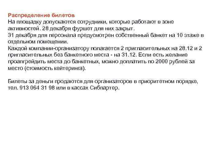 Распределение билетов На площадку допускаются сотрудники, которые работают в зоне активностей. 28 декабря фуршет для них закрыт. 31 декабря для персонала предусмотрен собственный банкет на 10 этаже в отдельном помещении. Каждой компании-организатору полагается 2 пригласительных на 28. 12 и 2 пригласительных без банкетного места - на 31. 12. Если есть желание проапгрейдить места до банкетных, можно доплатить по 2000 рублей за место (стоимость кейтеринга). Билеты за деньги продаются для организаторов в приоритетном порядке, тел. 913 064 31 98 или в кассах Сибпартер.