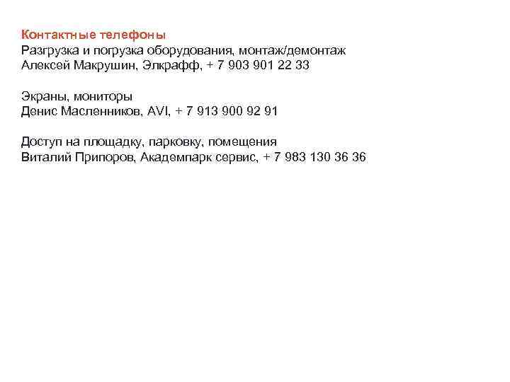 Контактные телефоны Разгрузка и погрузка оборудования, монтаж/демонтаж Алексей Макрушин, Элкрафф, + 7 903 901 22 33 Экраны, мониторы Денис Масленников, AVI, + 7 913 900 92 91 Доступ на площадку, парковку, помещения Виталий Припоров, Академпарк сервис, + 7 983 130 36 36