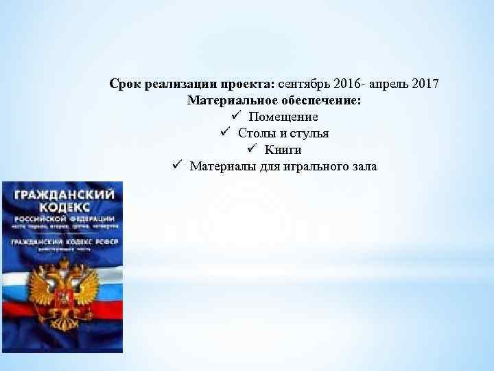 Срок реализации проекта: сентябрь 2016 - апрель 2017 Материальное обеспечение: ü Помещение ü Столы и стулья ü Книги ü Материалы для игрального зала