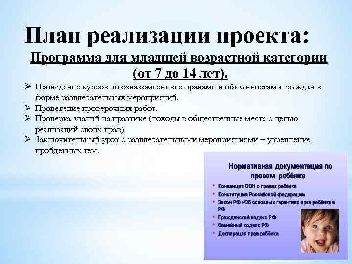 План реализации проекта: Программа для младшей возрастной категории (от 7 до 14 лет). Ø Проведение курсов по ознакомлению с правами и обязанностями граждан в форме развлекательных мероприятий. Ø Проведение проверочных работ. Ø Проверка знаний на практике (походы в общественные места с целью реализаций своих прав) Ø Заключительный урок с развлекательными мероприятиями + укрепление пройденных тем.