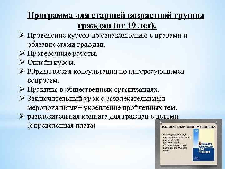 Программа для старшей возрастной группы граждан (от 19 лет). Ø Проведение курсов по ознакомлению с правами и обязанностями граждан. Ø Проверочные работы. Ø Онлайн курсы. Ø Юридическая консультация по интересующимся вопросам. Ø Практика в общественных организациях. Ø Заключительный урок с развлекательными мероприятиями+ укрепление пройденных тем. Ø развлекательная комната для граждан с детьми (определенная плата)