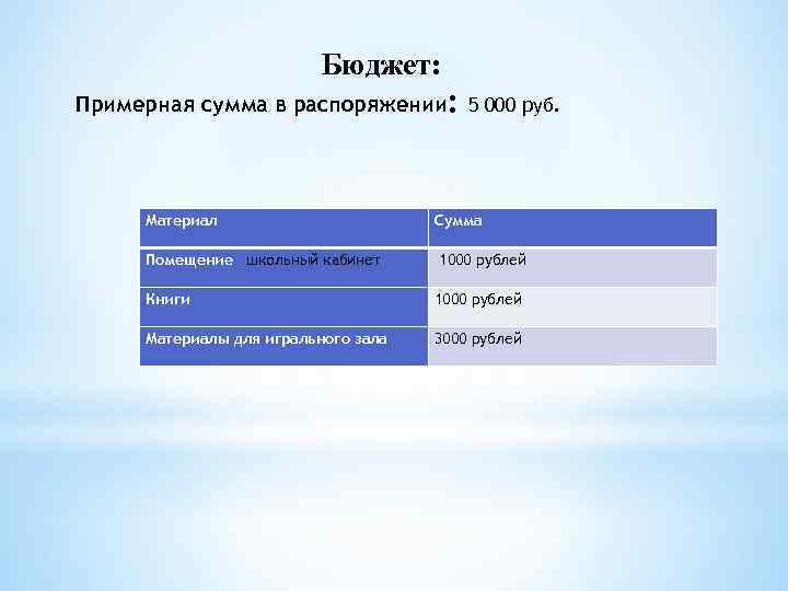 Бюджет: Примерная сумма в распоряжении: 5 000 руб. Материал Помещение школьный кабинет Сумма 1000 рублей Книги 1000 рублей Материалы для игрального зала 3000 рублей