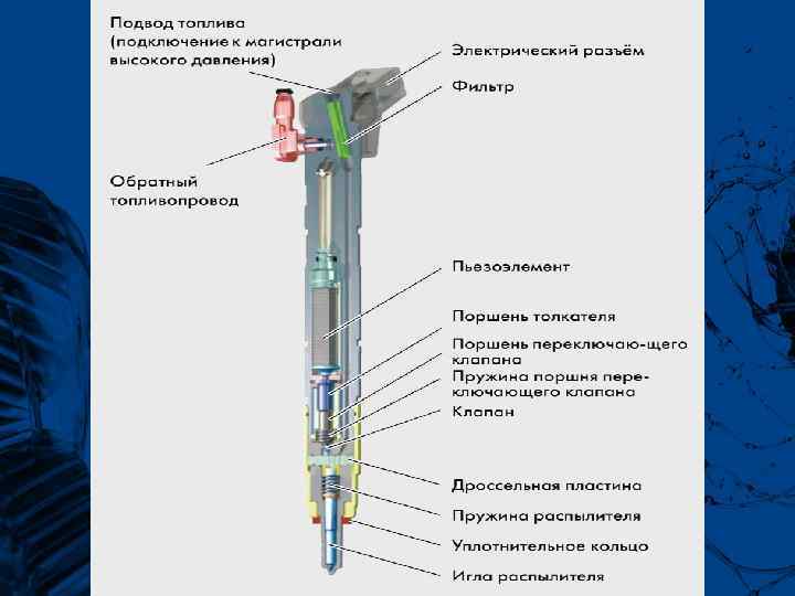 Форсунки В данной системе впрыска Common Rail используются пьезоэлектрические форсунки. Управление форсунками осуществляется исполнительным механизмом, основанном на использовании пьезоэлемента. Скорость переключения такого механизма во много раз выше, чем у форсунки с электромагнитным клапаном. Кроме того, масса подвижной иглы у распылителя пьезоэлектрической форсунки примерно на 75 % меньше, чем у форсунки с электромагнитным приводом. Это обеспечивает пьезоэлектрическим форсункам следующие преимущества: * короткое время переключения * возможность произвести несколько впрысков в течение рабочего такта * точность дозировки впрыска