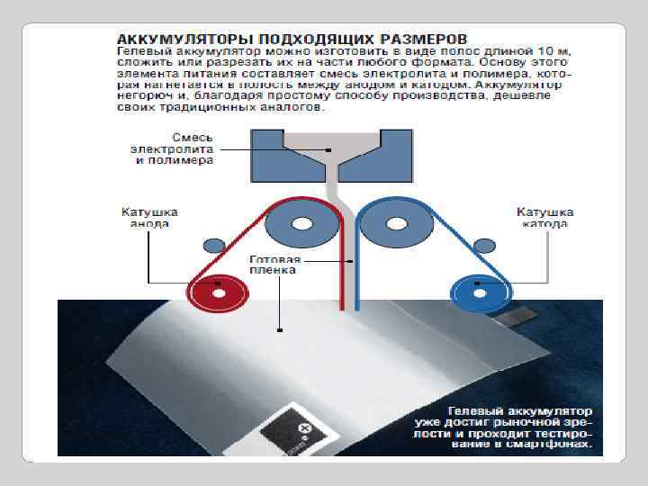 Недорогие и надежные аккумуляторы Недостатков по короткому замыканию лишен гелевый аккумулятор: его основные компоненты на 70% состоят из жидкого электролита, который вместе с полимерами доводят до состояния гелевой массы. В процессе изготовления гель нагнетают в полость между анодом и катодом, в результате чего образуется пленка. Такие аккумуляторы не горючи, к тому же благодаря относительно простому производству они имеют невысокую стоимость. Особым преимуществом такого элемента питания является его гибкость: его можно складывать или разрезать на части произвольных размеров. В отличие от классических батарей гелевый аккумулятор можно быстро подогнать по форме к любому устройству, разместив его, например, в виде тонкой пленки на тыльной стороне OLED-дисплея или под клавиатурой ноутбука. Однако обеспечить большую, в сравнении с литий-ионными аккумуляторами, мощность он, к сожалению, не способен.