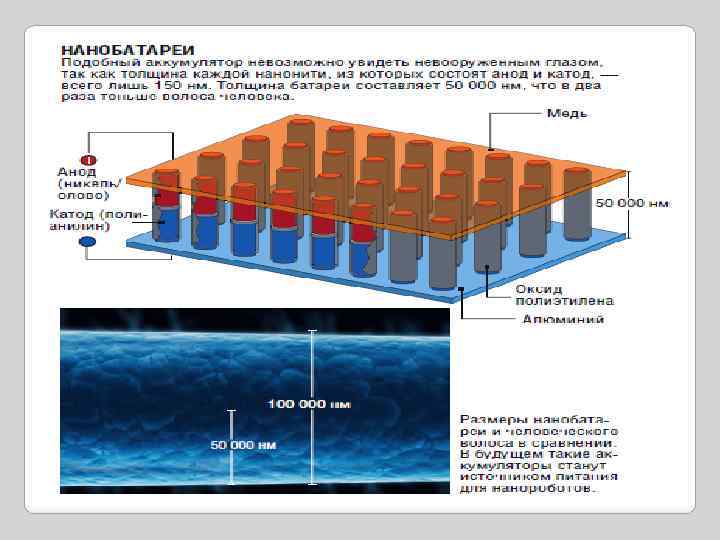 Нанобатареи для медицины Проблемой энергоснабжения электромобилей занимаются также американские ученые университета Райс в Хьюстоне, штат Техас. Однако предмет их исследовательского проекта не столь масштабен: вот уже несколько лет ученые работают над нано-роботами для медицинских целей, которые способны самостоятельно обнаруживать болезни в организме человека и, используя медикаменты, целенаправленно их устранять. И хотя подобных роботов еще не существует, специалистам удалось изобрести необходимый источник питания. Их нано-батареи представляют интерес не только для медицины. Благодаря крохотным размерам эти миниатюрные источники энергии можно нанести на любую поверхность, даже бумагу. Гибридный элемент на основе суперконденсаторов и батарей состоит из тысячи сверхтонких нитей (нано-нитей). Размеры одной нано-нити не превышают 150 нм. Толщина всей батареи составляет всего лишь 50 000 нм, поэтому для человеческого глаза она практически неразличима. Анод данной батареи состоит из никеля и олова, катод — из поли-анилина. В качестве проводника используется гелеобразный оксид полиэтилена, а для создания закрытой электрической цепи на нити наносятся алюминий и медь.