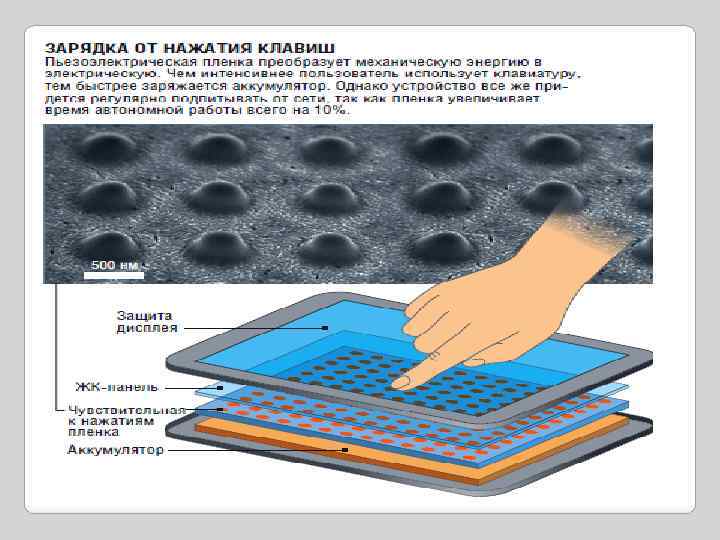 Питание от механических воздействий Более широкую область применения подразумевает технология, благодаря которой батарея ноутбука или планшета сможет подзаряжаться от нажатий кнопок клавиатуры или сенсорного дисплея. На первый взгляд это звучит парадоксально, но скоро может стать реальностью благодаря появлению специальной, чувствительной к нажатиям пленки. Принцип ее действия заключается в том, что генерируемая пользователем (например, при наборе текста) механическая энергия преобразуется в электрическую и используется для подзарядки батареи. Теоретически данный пьезоэлектрический эффект возникает тогда, когда кристаллы (например, кварц) деформируются. Практическая реализация этой технологии, предусматривающей использование наноэлементов, довольно сложна. Ученым Мельбурнского королевского технологического института в Австралии удалось измерить давление и возникающие при этом напряжение и силу тока — и все это в пределах 10– 100 нм. Генерируемое при нажатиях клавиш электричество позволяет продлить автономную работу ноутбука или планшета приблизительно на 10%.