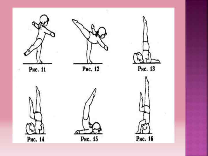 Дети выполняют: 1. Высокое равновесие: тело прямо, выпрямленная нога отводится назад, руки в стороны (рис. 11) 2. Равновесие «Ласточка» : тело прогнуто, нога отводится назад Стойки делают из положения сидя на полу перекатом назад. 1. Стойка на лопатках: тело выпрямлено, колени и носки вытянуты, руки на полу или поддерживают ребенка под спину(рис. 13)