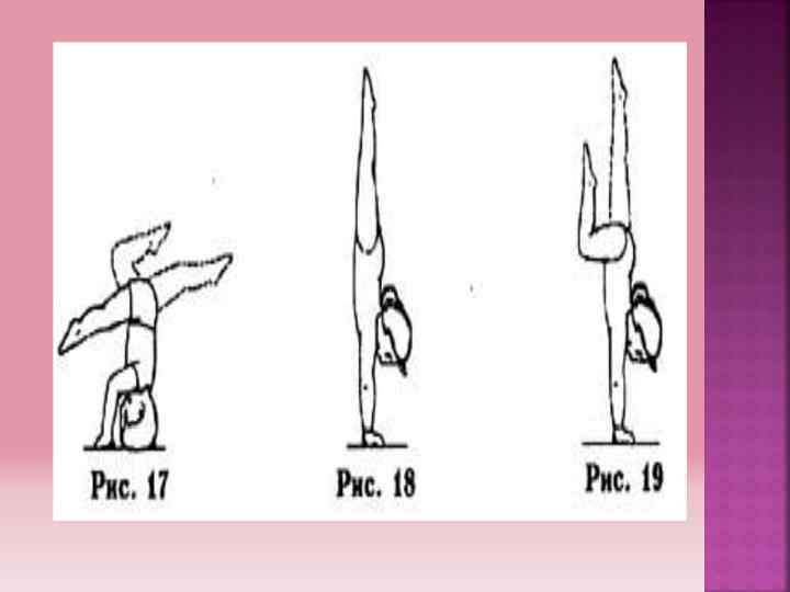 4. Стойка на руках: наклониться, поставить руки на пол, махом левой и толчком правой ноги выйти в стойку , соединяя ноги в вертикальном положении, тело выпрямить, смотреть на кисти ( рис. 18. ) Вариант: в стойке на руках согнуть одну ногу (рис. 19)