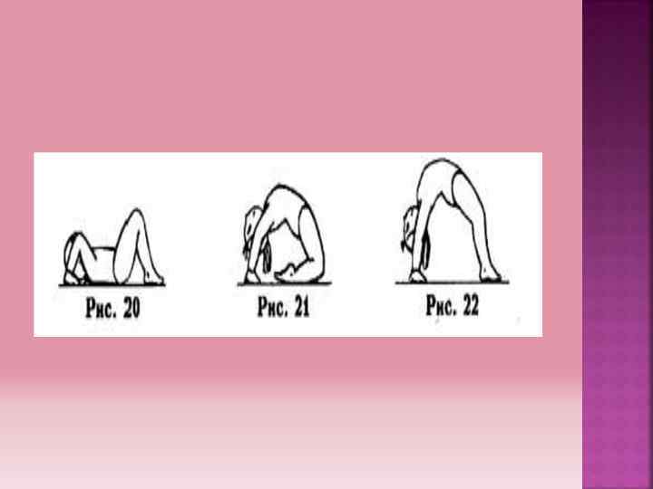 Мосты 1. Мост из положения лежа на спине с согнутыми ногами: опираясь руками в пол у плеч, прогнуться в мост, разгибая ноги и ноги ( рис. 20) 2. Мост на коленях: из стойки на коленях наклониться назад до касания руками пола (рис. 21) 3. Мост наклоном назад: из положения стоя ноги врозь наклониться назад до опоры руками на мат(рис. 22)