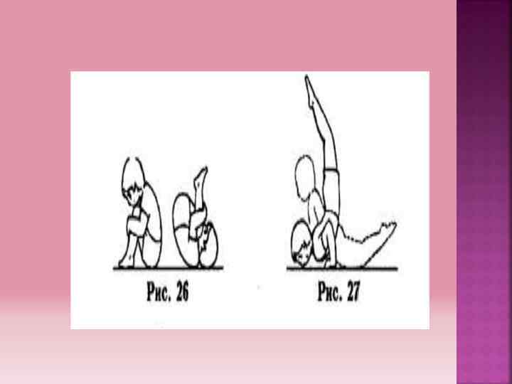 Перекаты 1. Перекат в группировке: из положения сидя, группируясь, выполнить перекат назад до упора затылком о пол, перекатом вперед вернуться в исходное положение ( рис. 26) 2. Перекат вперед и назад прогнувшись: из положения лежа прогнувшись, сгибая руки, выполнить перекат вперед прогнувшись, поднимая ноги в положение, близкое к стойке на груди, перекатом назад прогнувшись, вернуться в исходное положение(рис. 27)
