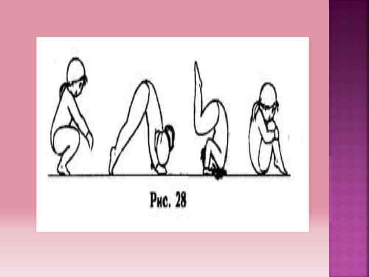 Кувырки Кувырок вперед: из положения присев, руки поставив на ширину плеч, на расстоянии шага от ног, толчком ног выполнить кувырок вперед, наклоняя голову так, чтобы опереться на мат затылком и шеей, сразу же сгруппироваться, не отпуская рук до полного завершения кувырка, вернуться в исходное положение( рис. 28)